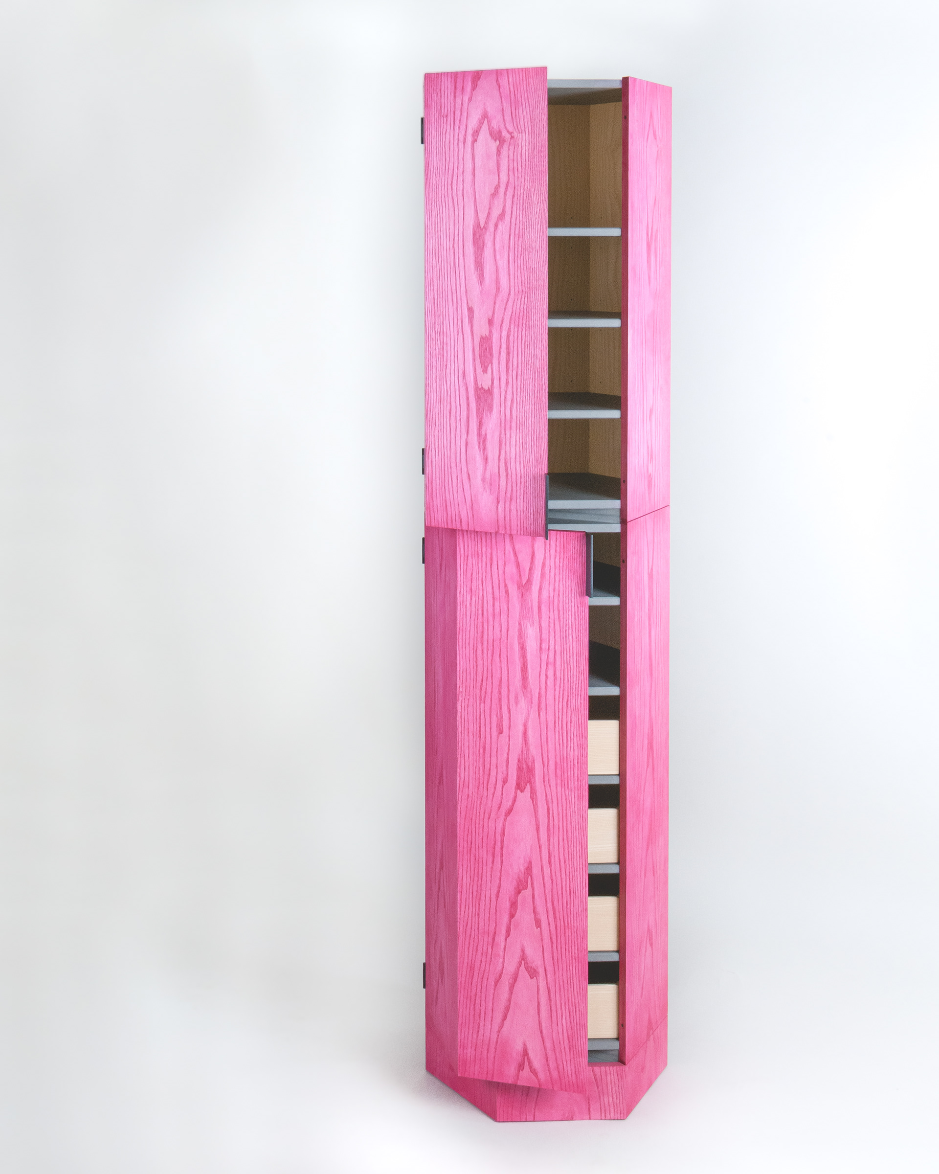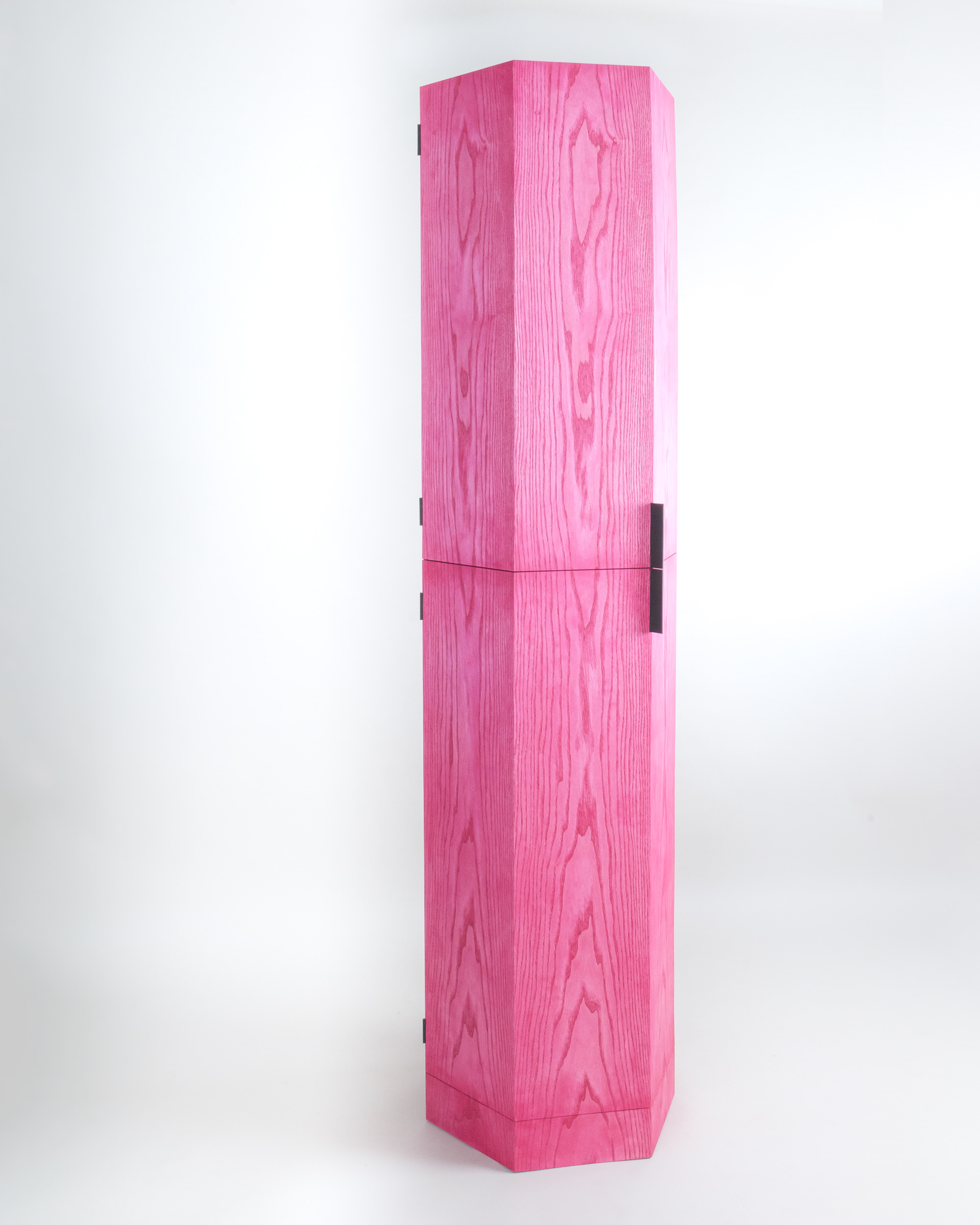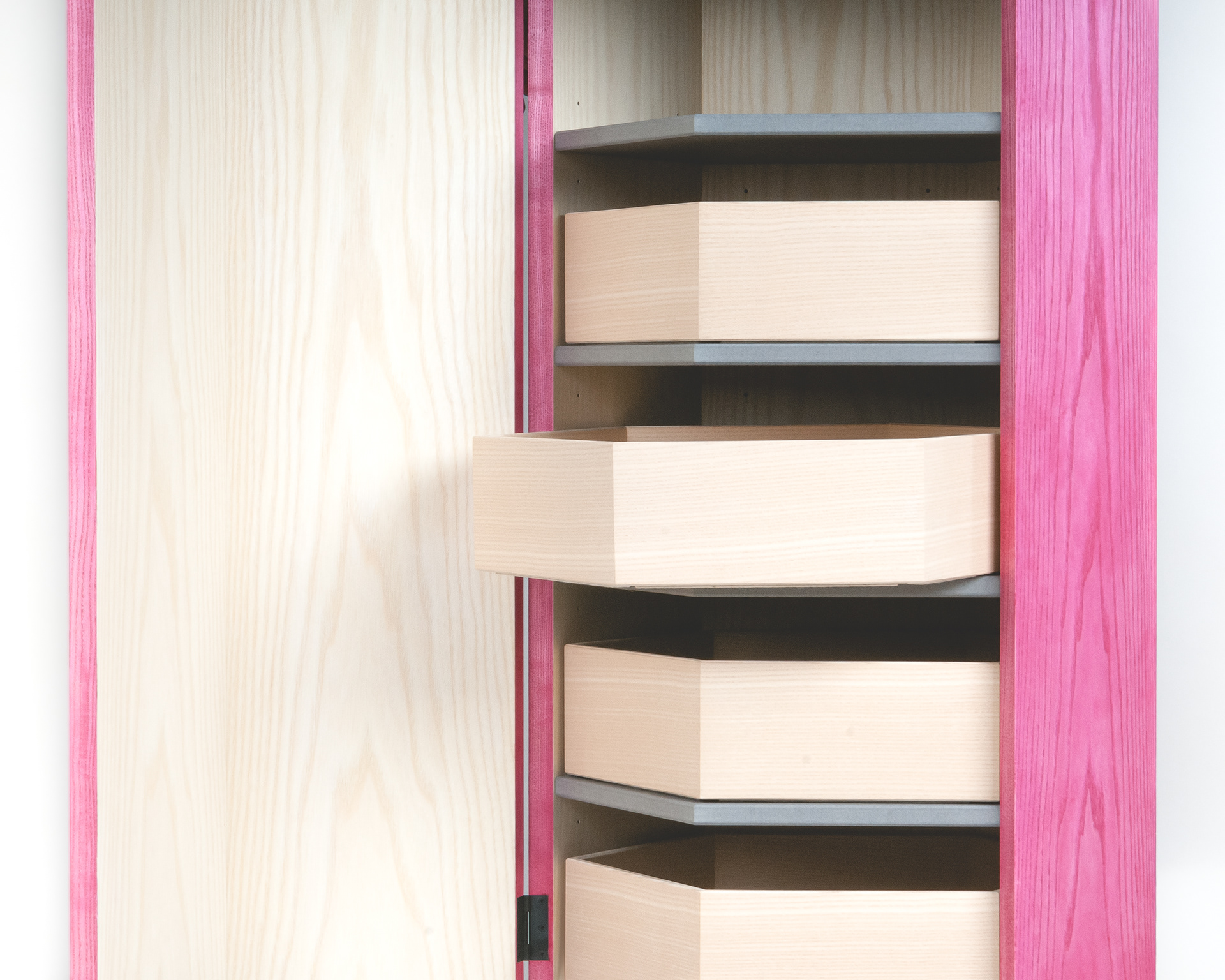 Meinem Mut und Experimentierfreude hat die pinke „Eschenfassade“ ihre Farbigkeit zu verdanken. Sie stellt einen polarisierenden Blickfang dar und hebt die Fladerung des Fur- niers hervor. Den Innenraum, welcher sich hinter einer Koffertüre verbirgt, ist hingegen in Esche-Natur gehalten. Klar abgesetzt ist auch der Boden und der Deckel aus grauem Valchro- mat. Die variablen Fachböden aus Valchromat nehmen die sechseckige Grundform auf und bieten mehr Ablagefläche.