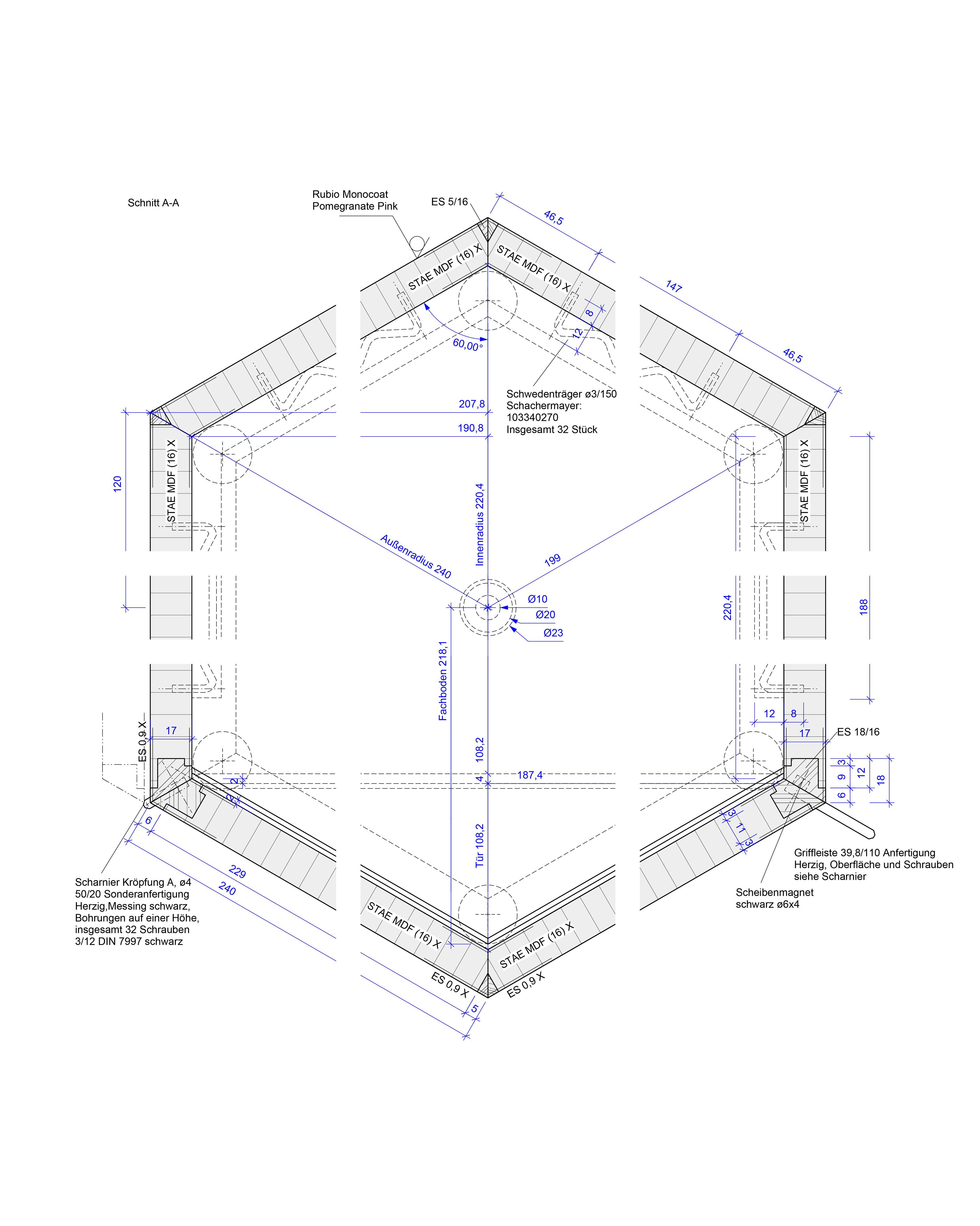 Der Korpus ist geteilt und hat die Grundform eines gleichmäßigen Sechseckes. Dies ermög- licht die Türen bei der Montage in verschiedene Richtungen auszurichten oder die Korpusse getrennt aufzustellen. So kann das Möbel bei Bedarf von verschiedenen Seiten bedient werden Die 4 Bänder sind in schwarz gehalten, um deren Hervorstehen möglichst zurückhaltend zu gestalten. Selbiges gilt für die Griffe, welche wie die Bänder abgefast werden.